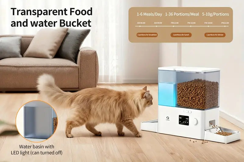 The massive 5-liter (approx. 21-cup) food reservoir holds enough kibble to feed a typical cat or small dog for 2–3 weeks. The crystal-clear 2L water tank with a calming blue LED light not only makes it easy to see the water level but also entices your pet to drink more. More independence for you, consistent nourishment for them. -